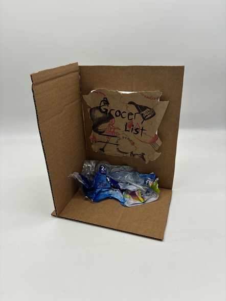 Our idea is to create either a giant menu featuring a selection of appetizers, entrees, main dishes, and desserts or a shopping list that has a variety of groceries including the plastic packaging they come in. Near the bottom of the piece would either be the plastic hanging off the piece, plastic filling a shopping cart, or plastic bags filled and piled below the list with the same plastic they come in, to symbolize the large amount of plastic that is wasted with each meal we eat. To create this installation we will collect food plastic packaging that we already have and possibly build or obtain a shopping cart. This idea exposes our message about how much food packaging is thrown out and how it needs to be reduced.